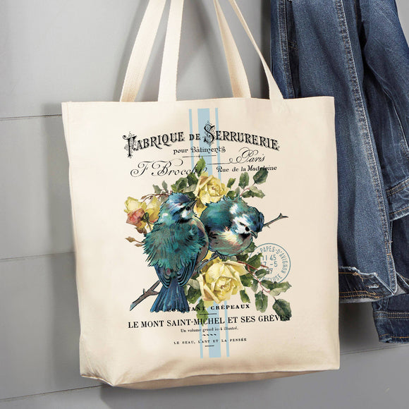 Vintage French Birds Roses 12 oz Canvas Tote Bag